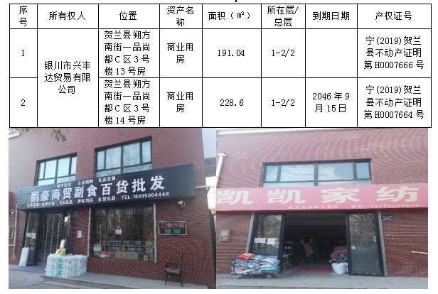 該戶債權(quán)項下位于賀蘭縣朔方南街一品尚都的抵押物,周圍商業(yè)氛圍較好,目前兩套房產(chǎn)均有承租人;青銅峽市峽口鎮(zhèn)談橋村的土地和車間位于青銅峽市峽口鎮(zhèn)譚橋村侯余公路南側(cè),即青銅峽市佳美紙業(yè)有限責(zé)任公司廠區(qū),目前因債務(wù)人資金短缺,暫時處于停產(chǎn)、關(guān)閉狀態(tài)。
