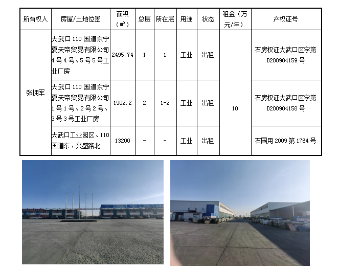 該戶債權抵押物位于110國道邊,交通便利園區(qū)整體方正、規(guī)劃清晰,目前處于出租狀態(tài),租金10萬/年。廠區(qū)空地面積較大,可用于倉儲物流及各類輕工業(yè)生產加工。