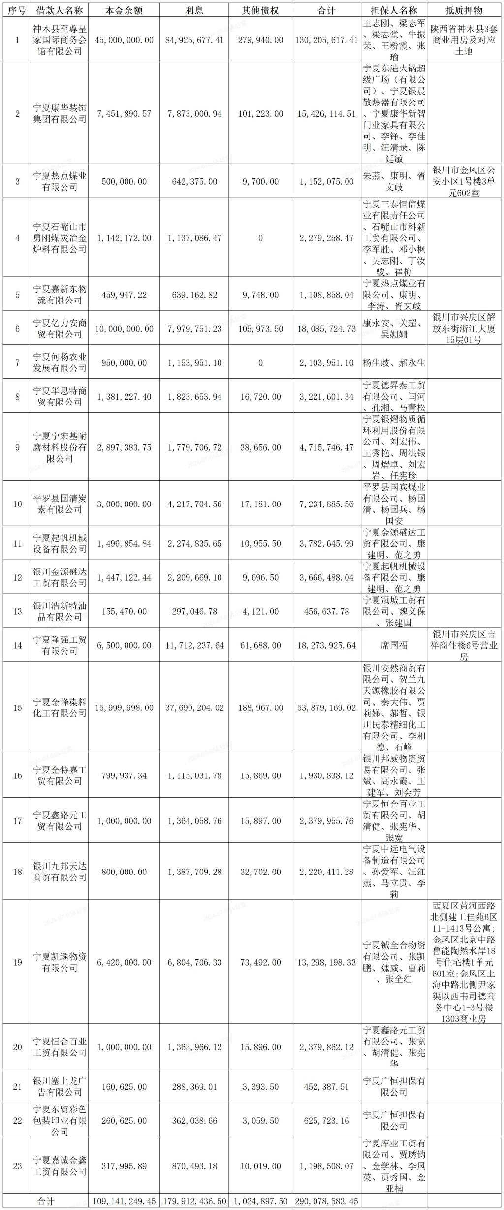寧夏金融資產(chǎn)管理有限公司近期擬對(duì)持有的寧夏億力安商貿(mào)有限公司等23戶不良債權(quán)所有權(quán)進(jìn)行公開轉(zhuǎn)讓。截至2024年1月31日,債權(quán)本息合計(jì)29007.86萬元,其中:本金10914.12萬元,利息17991.24萬元,其他債權(quán)102.49萬元。